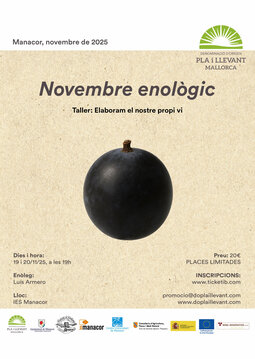 Durant el mes de novembre tens una cita amb la DOP Pla i Llevant a Manacor. En aquesta segona activitat ens convertirem en autèntiques vinateres i vinaters elaborant el nostre propi vi partint de vinificacions fetes amb varietats locals i internacionals. Una aproximació necessària per conèixer de primera mà les varietats que componen els nostres vins. Aquest taller serà impartit per l'enòleg Luís Armero.